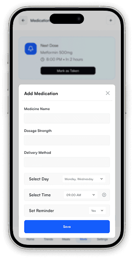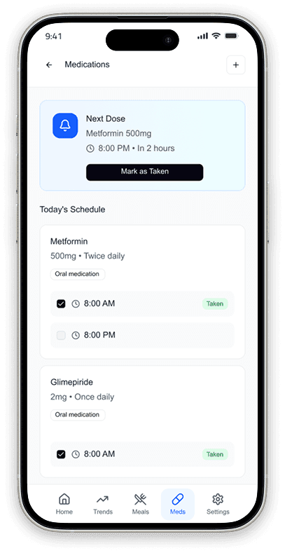 Medication adherence is as critical as glucose monitoring. Elevate medications to first-class feature with dedicated navigation and proactive reminders—not buried in settings.