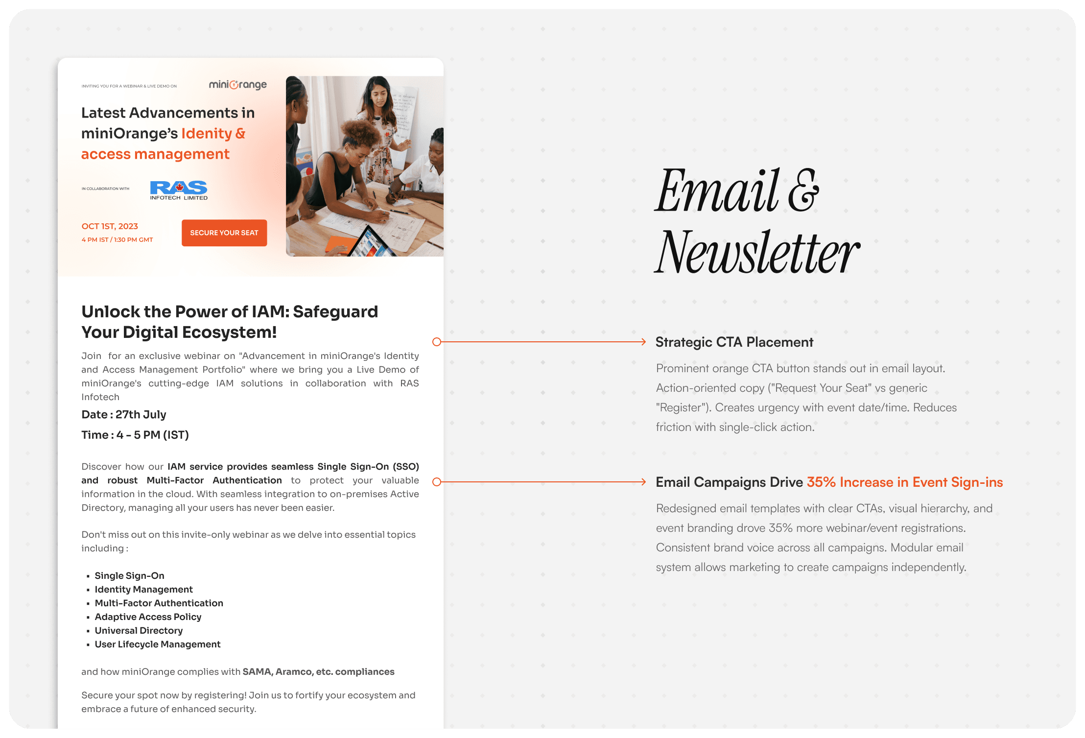 The miniOrange rebrand reimagines the company's presence across three, a redesigned website, a modular visual assets library, and a scalable conference system, turning an overlooked vendor into a brand enterprise buyers confidently choose.